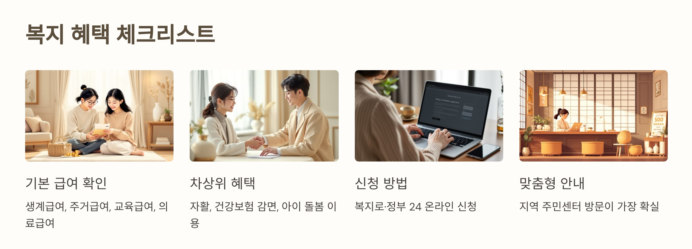 정부 복지 제도는 매우 다양하지만 그만큼 복잡하고 신청 누락도 잦습니다. **현재 소득이 낮고 생활이 어려운 상황이라면 복지센터 상담을 통해 반드시 본인의 자격 여부를 확인하고 지원을 받는 것이 중요합니다.