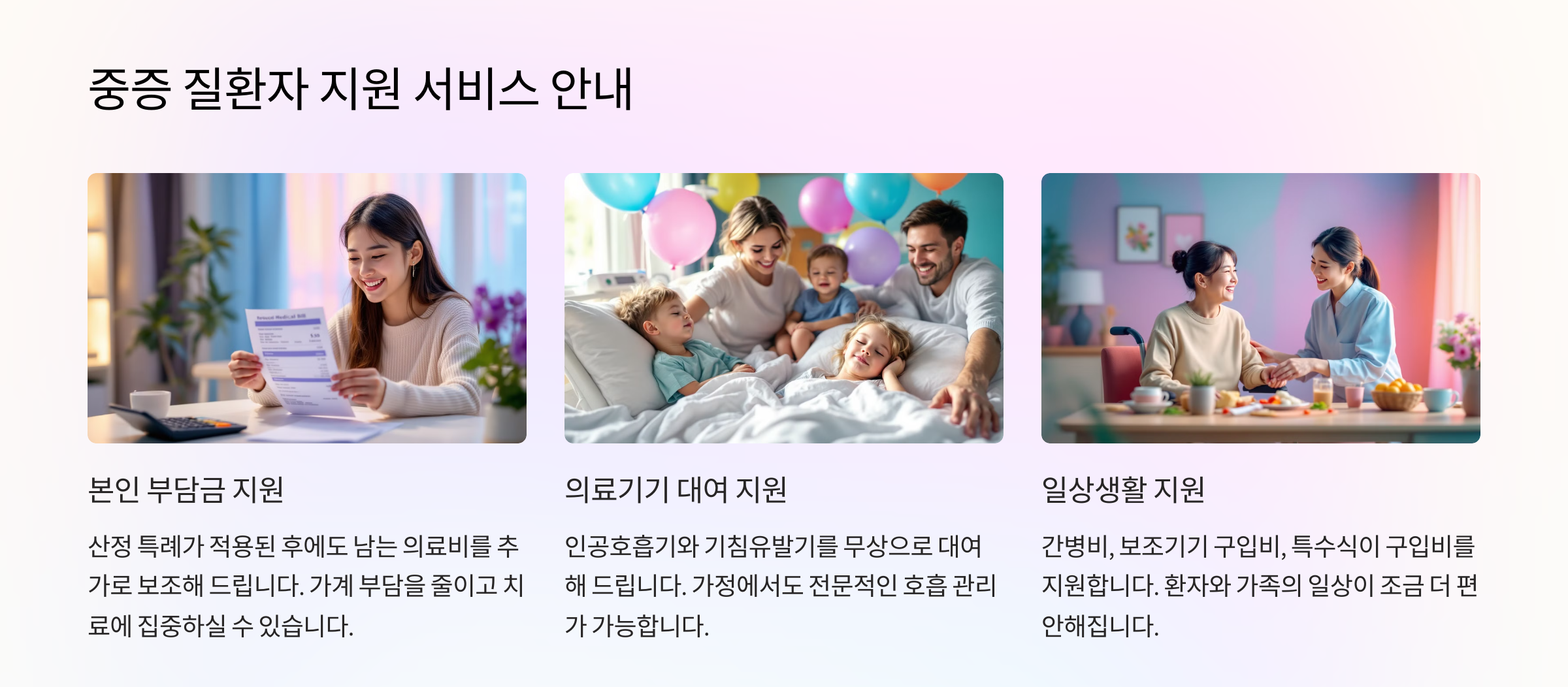 근육병 및 호흡기 장애를 동반한 일부 희귀질환 환자가 지원 대상이며 의료진의 진단과 처방이 필요합니다.