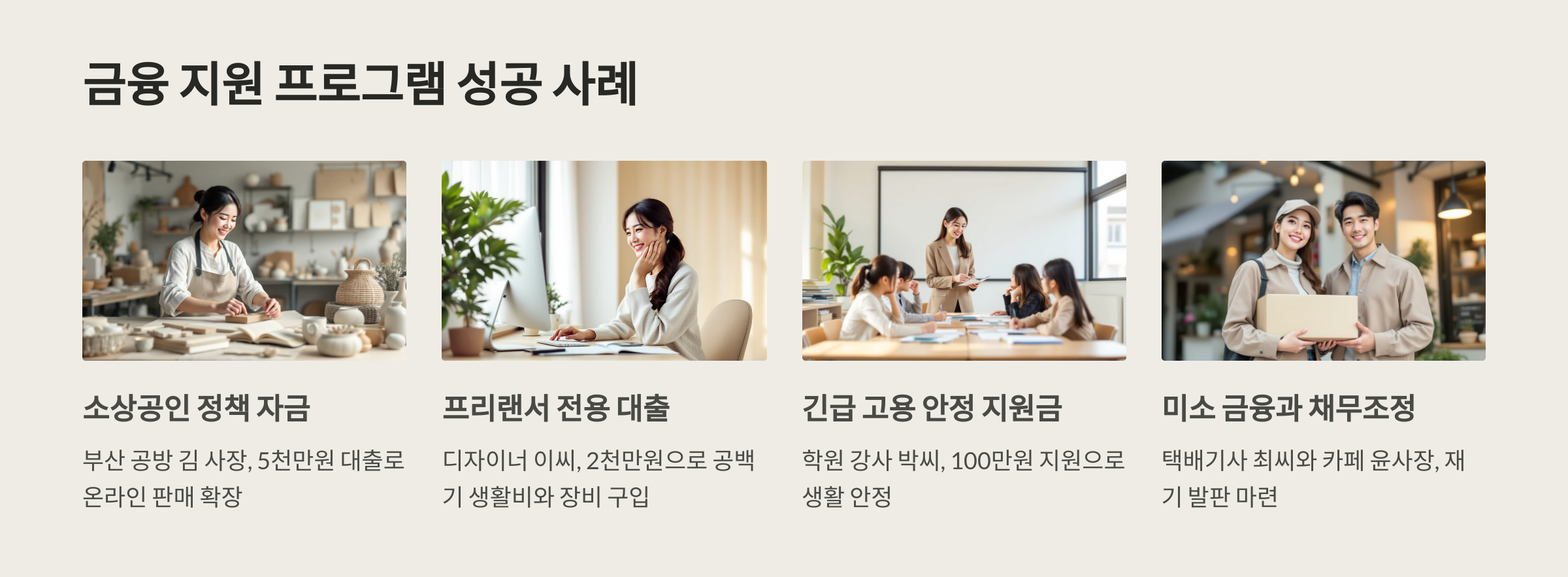 실제 사례 : 부산에서 작은 공방을 운영하는 김 사장님은 코로나19로 인해 매출이 급감하자, 정책자금을 통해 5천만 원을 대출받아 운영자금을 확보했습니다. 이를 통해 공방을 지속적으로 운영할 수 있었으며 현재는 온라인 판매를 병행하여 매출을 회복하고 있습니다.